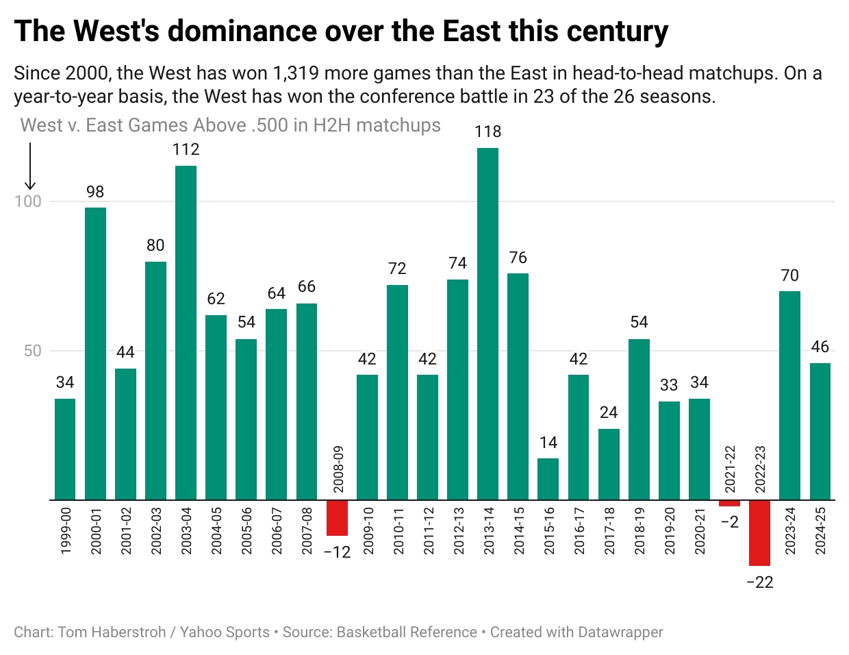 07月05日讯 今日记者Mr. Statistician Face Man在社交媒体上发布了一张自2000年以来东西部战绩对比(如下),据统计,东西部双方直接交锋中,西部比东部多赢了1,319场比赛。除此之外,西部在过去26个赛季的分区对决里赢下了23个赛季: