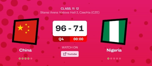 一开场,中国队率先发力,连投带罚打出13-2的开局,尼日利亚队强攻内线拿分努力追赶,中国女篮U19内外开花牢牢把握两位数领先,次节两队展开对攻,冉珂嘉连得5分后徐凤威罚球将分差拉开到20分,尼日利亚继续冲击篮筐频频得手苦苦支撑,李泳霖打成3+1,半场战罢中国女篮U19以56-35领先。下半场,中国队延续火力,一度将分差拉开到29分,尼日利亚连投带罚艰难回应,末节中国队稳扎稳打保持场上优势,最终,中国女篮U19以96-71轻取尼日利亚队,以第11名的成绩收官。