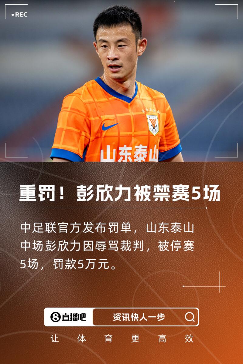 07月05日讯 中足联官方今日发布处罚公告,泰山中场彭欣力因在对阵河南的比赛中辱骂裁判员,被停赛5场并罚款5万。