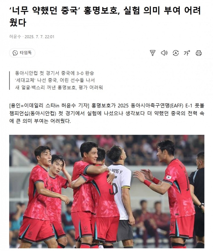 洪明甫军团在东亚杯首场比赛中进行了实验,但由于对手中国队的实力比预想中更弱,很难赋予太大的意义。