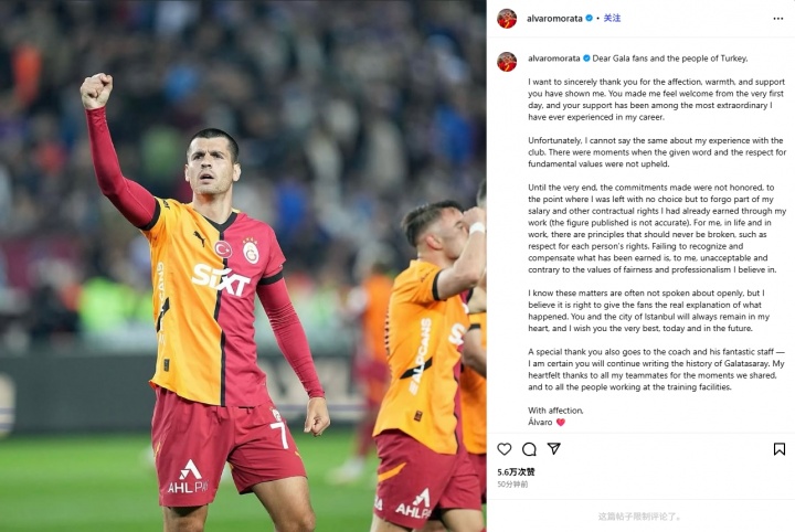 08月12日讯 加拉塔萨雷昨日官宣莫拉塔离队,据悉他即将加盟意甲球队科莫。今日,莫拉塔发文告别土耳其球迷,同时炮轰加拉塔萨雷。