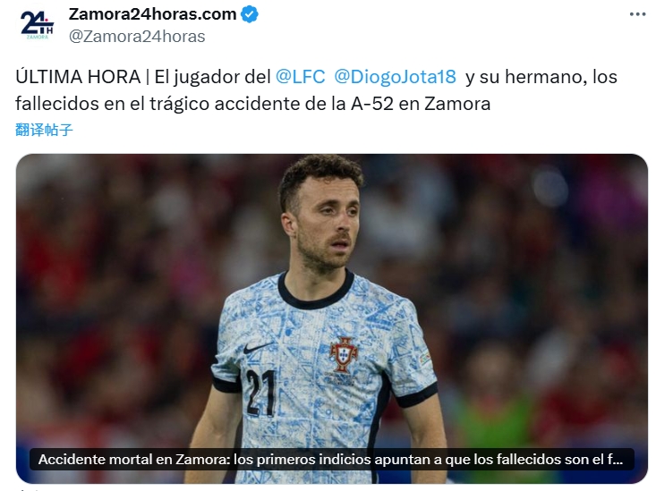 初步迹象表明,葡萄牙球员迪奥戈-若塔,现年28岁,目前效力于利物浦足球俱乐部,以及他的兄弟安德烈,葡甲佩尼亚菲尔俱乐部的球员,是周四凌晨12点半后在塞尔纳迪利亚地区A-52高速公路65公里处发生的一起悲惨事故中不幸身亡的两名年轻人。